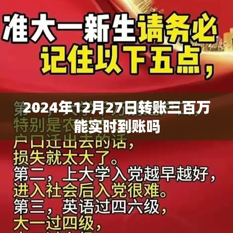 对于2024年12月27日转账三百万能否实时到账的问题,我们可以从以下几个方面进行分析: